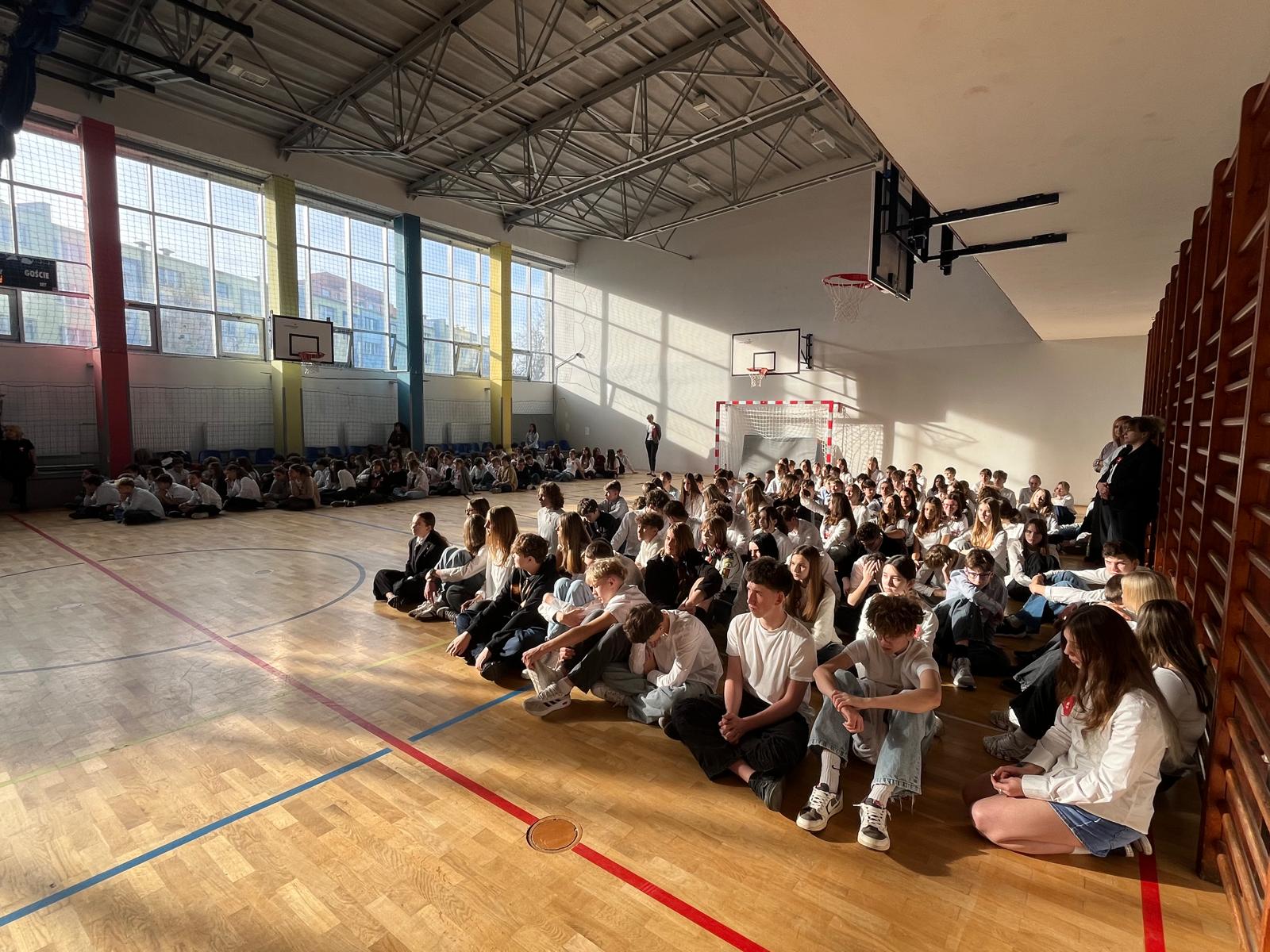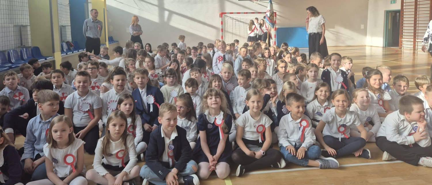 Uczniowie prezentowali się elegancko w strojach galowych, a biało-czerwone kotyliony przypięte do ich ubrań dodawały uroczystości wyjątkowego charakteru.