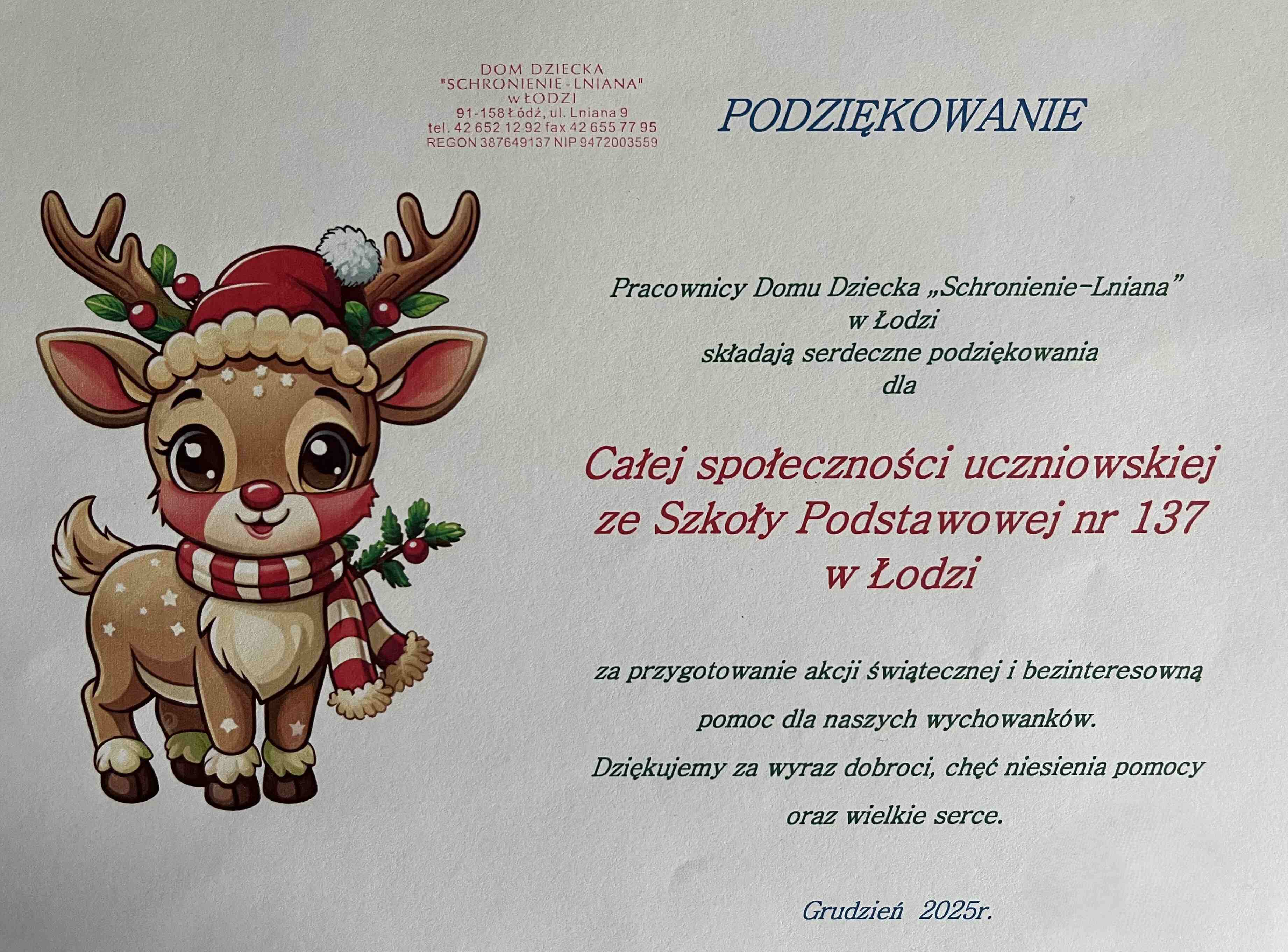Dziękujemy całej społeczności szkolnej za zaangażowanie w akcję dla wychowanków Domu Dziecka „Schronienie – Lniana” w Łodzi.