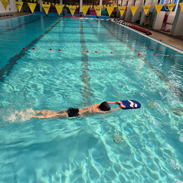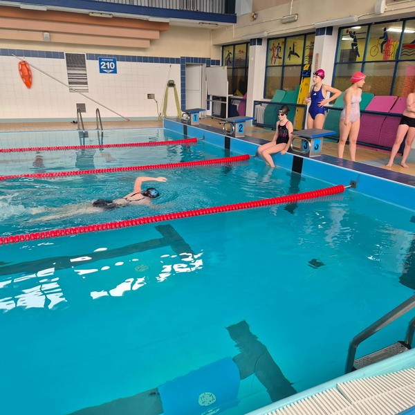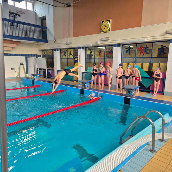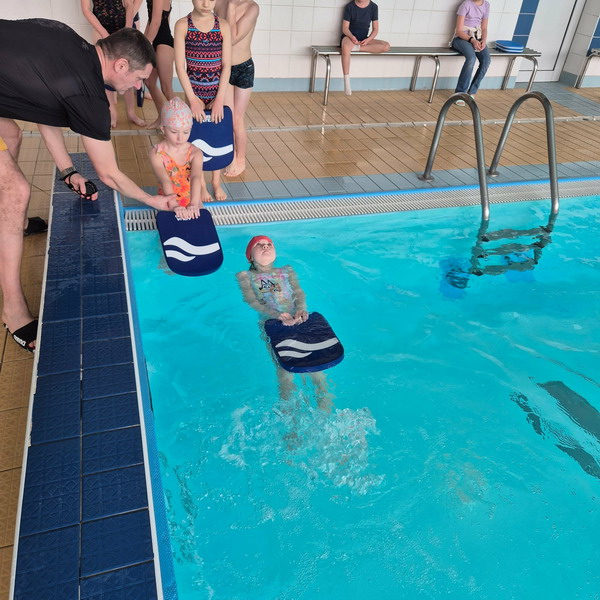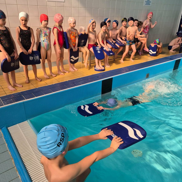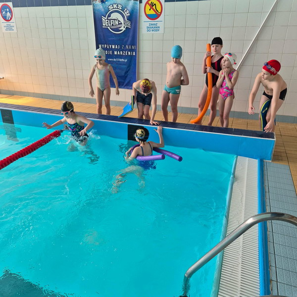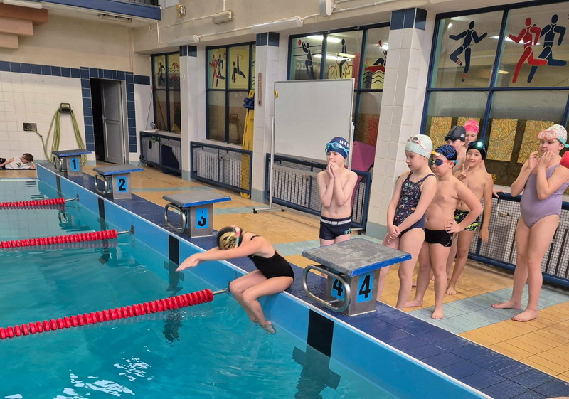 Jedną z głównych atrakcji były sztafety pływackie, które dostarczyły mnóstwo emocji. Uczniowie wszystkich klas z zaangażowaniem opływali świat dookoła, dopingując się nawzajem i pokazując ducha fair play. Nie zabrakło śmiechu, chlapania i sportowej energii!